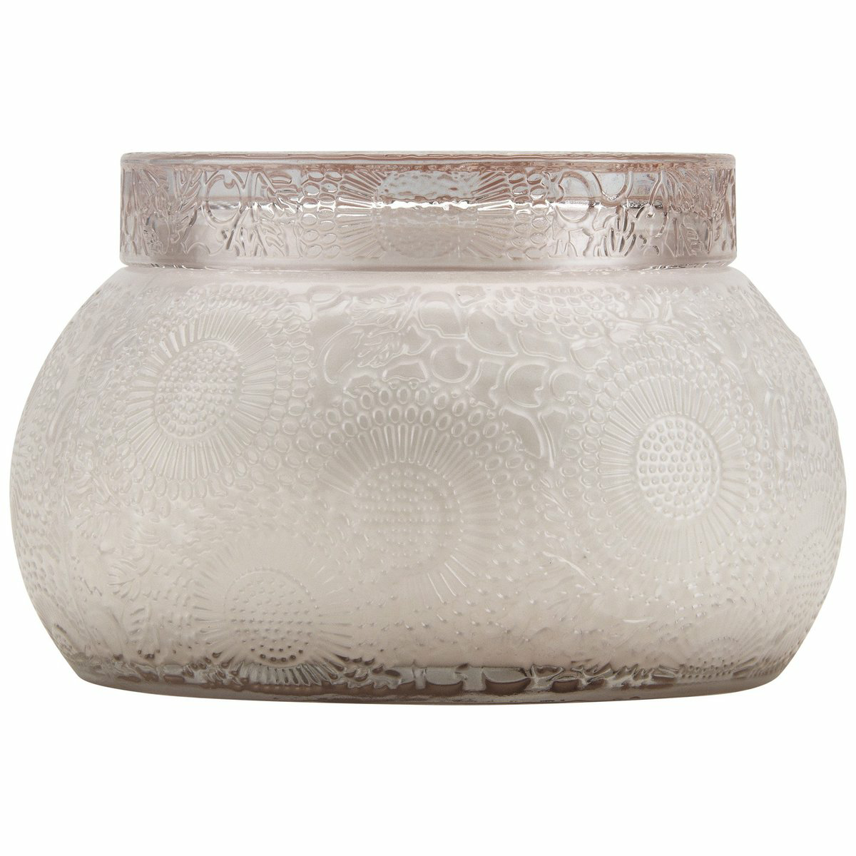 Its richness in both aroma and design is showcased in a lidded glass bowl; an ode to Japanese beauty. Embossed with salient detail, the container is a perfect centerpiece while accessorizing a space, as the clean burn delivers fragrance to every corner.