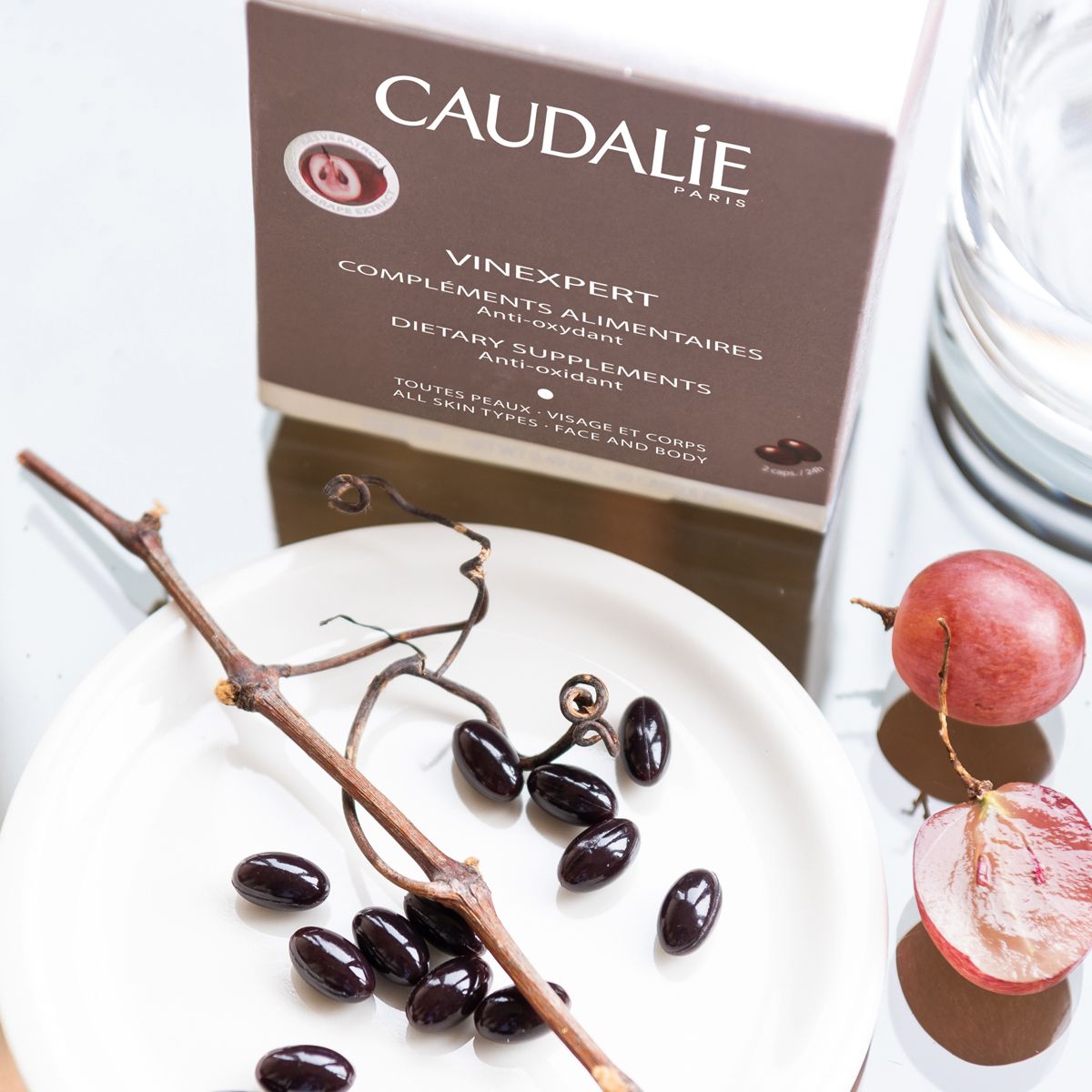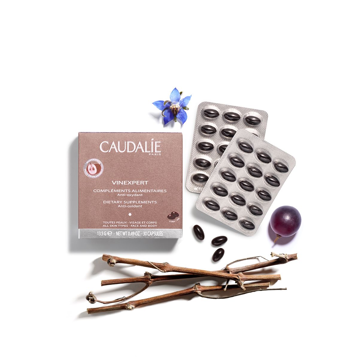 The French Paradox in a capsule! Grape extract has an anti-oxidant action, among the most powerful in the plant world, which protects cells from free radicals, the major cause of skin aging. Vinexpert dietary supplements contain a grape extract rich in anti-oxidant Resveratrol, starflower oil and evening primrose oil.